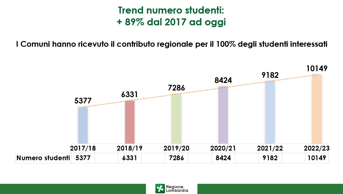 “In questi anni – commentano il presidente Fontana e l’assessore Tironi – la Giunta regionale ha sempre risposto finanziariamente all’intero fabbisogno di spesa manifestato dai Comuni. Questo sia per quanto riguarda il trasporto sia per l’assistenza, coprendo il 100 per cento delle richieste. Per l’Anno Scolastico e Formativo corrente 2022/2023 le richieste dei Comuni sono state pari a 67 milioni di euro: il bilancio regionale coprirà anche stavolta l’intero fabbisogno”.