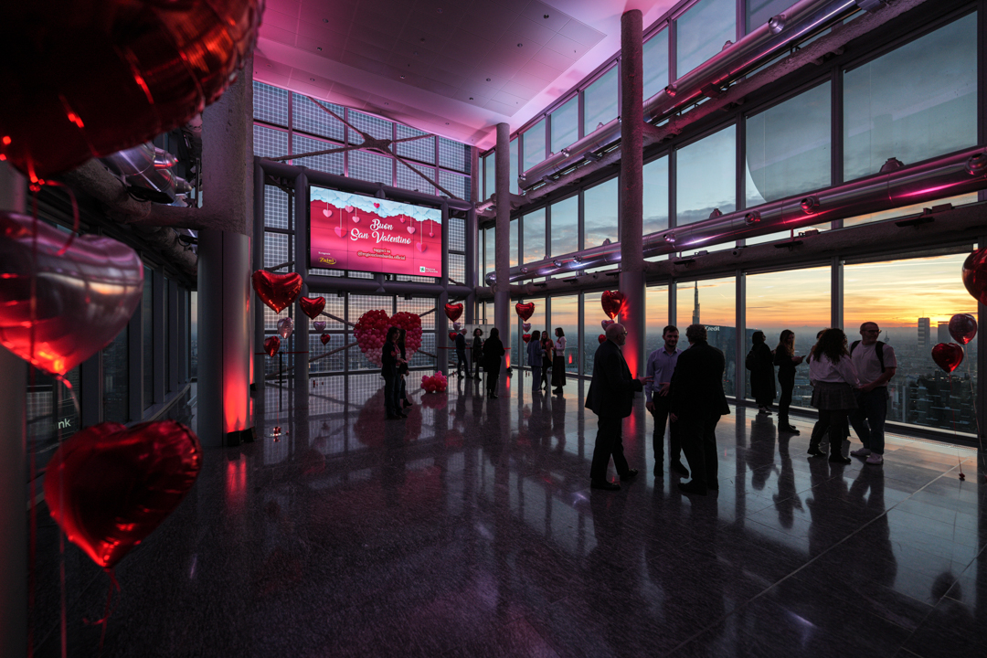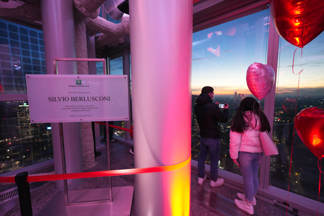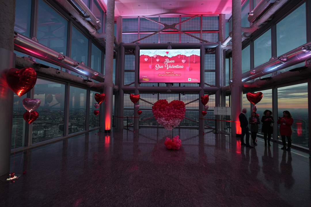 Dalle ore 18 fino alle 22, la sede della Regione Lombardia ha aperto le porte agli innamorati offrendo un tramonto mozzafiato e una scenografia di palloncini a forma di cuore in tutte le tinte del rosso. Circa 3.000 le persone che si sono registrate per accedere al Belvedere Silvio Berlusconi.