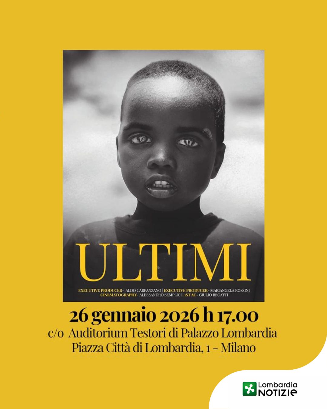 Lunedì 26 gennaio, all’Auditorium Testori di Palazzo Lombardia, si terrà la presentazione del documentario ‘Ultimi‘, un’opera prodotta da Studio Alca che accende i riflettori sulla drammatica situazione umanitaria e sociale del Sud Sudan.