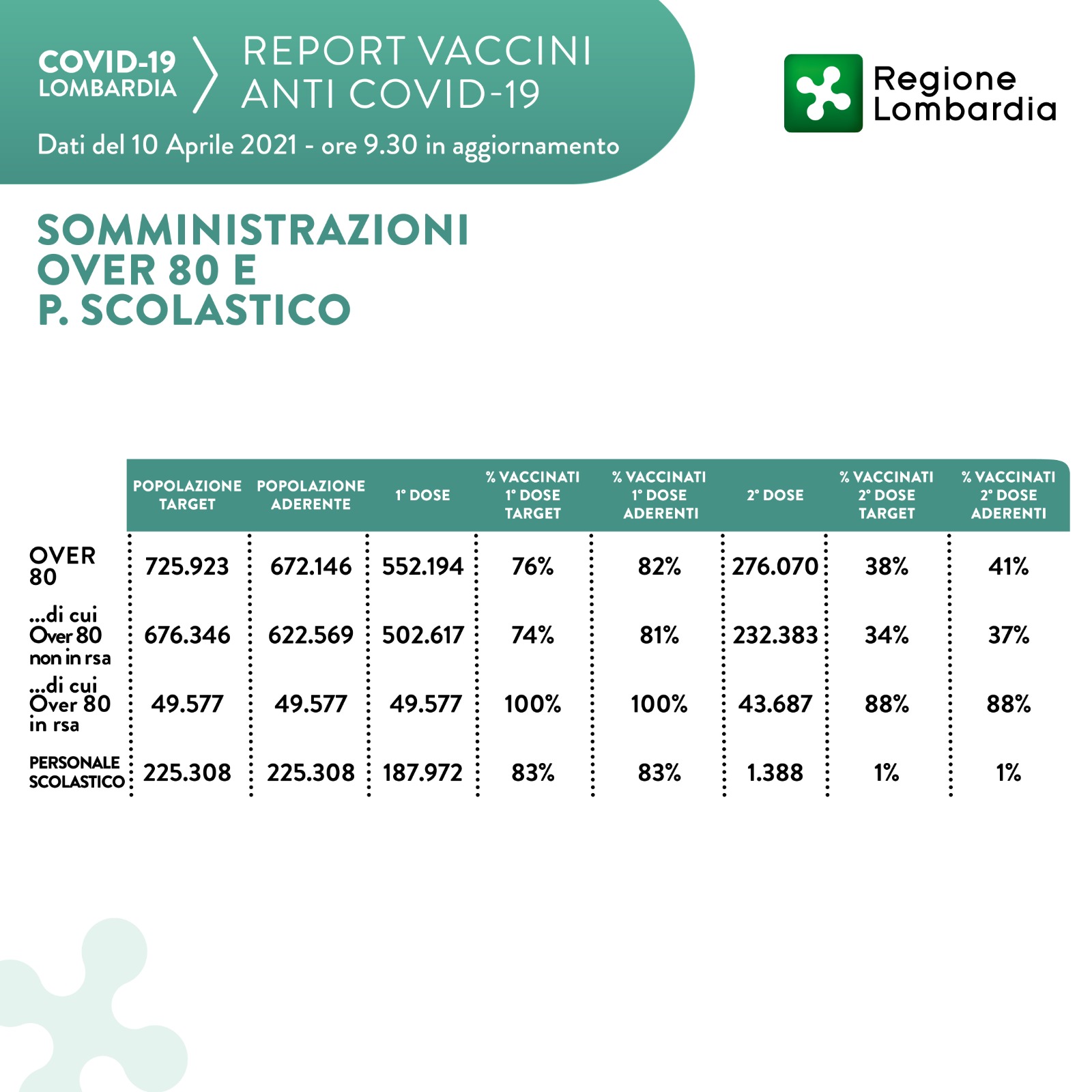 Gli over 80 che hanno diritto alla vaccinazione, in Lombardia, sono 725.923, di questi hanno aderito 592.146 (82%). A questa mattina, tra gli aderenti, sono state somministrate 236.181 dosi (%).